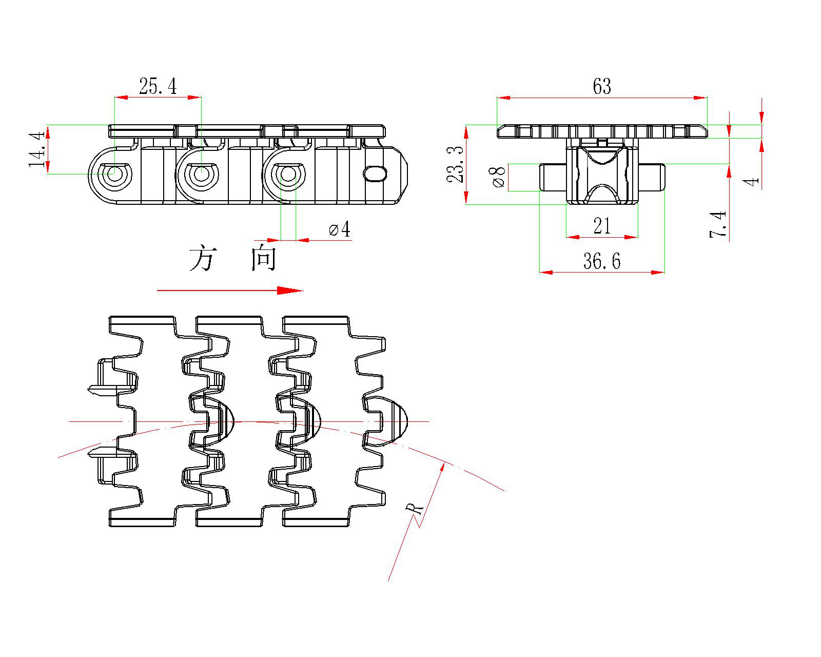 柔性鏈屬一種新型輸送帶,比傳統(tǒng)的輸送方式呈現(xiàn)著許多優(yōu)勢。具有高強度、耐酸、堿、鹽水等特點,溫度范圍廣,防粘性佳,可加檔板,提升角度大,容易清洗,維修簡單。柔性鏈可用于各種環(huán)境下的輸送,如醫(yī)藥行業(yè)、食品行業(yè)、包裝行業(yè)、日用化工行業(yè)、汽車行業(yè)、物流行業(yè)、娛樂設(shè)施、傳動輸送帶、輸送機設(shè)備等。