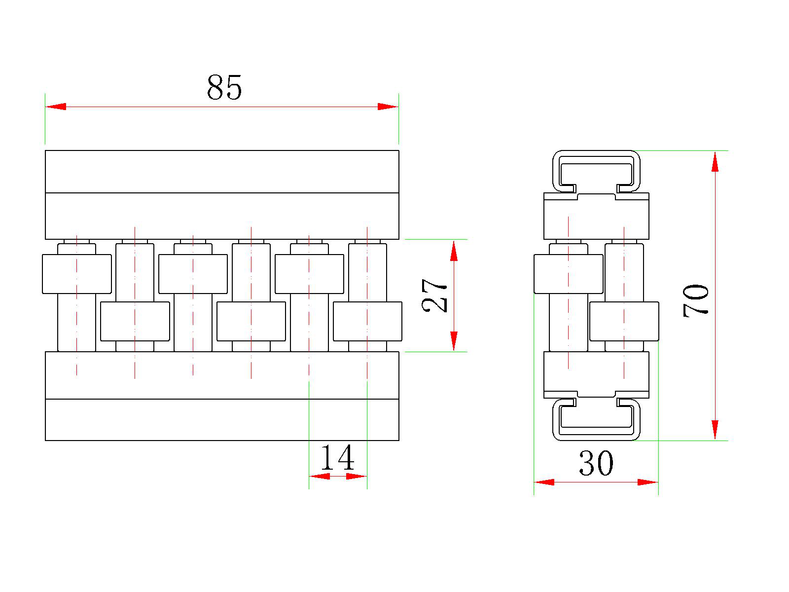 | 907 | 單排分道滾珠護(hù)欄 | 聚甲醛+不銹鋼 | 綠色 | 黑色 | 1M/根 |