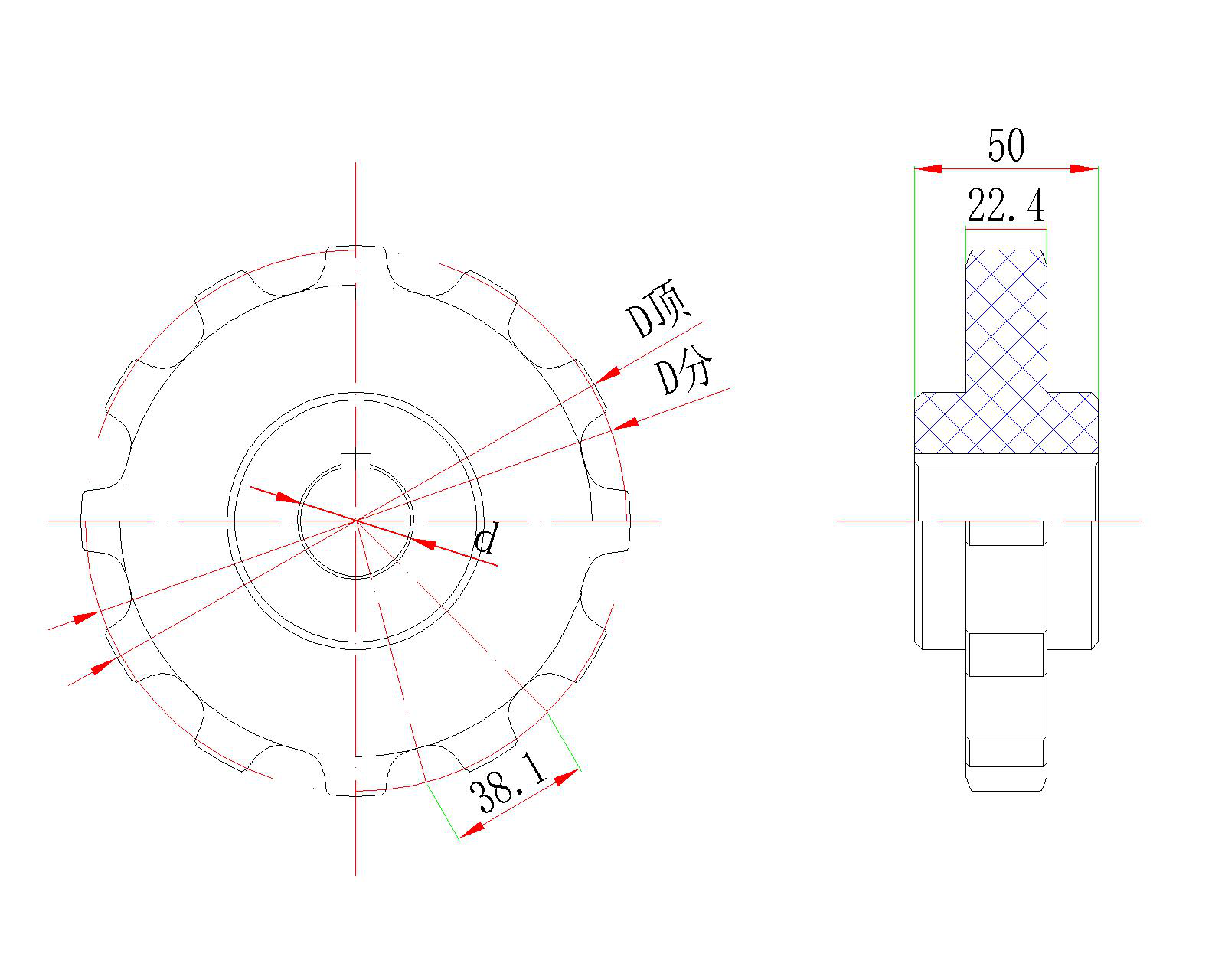 | 鏈輪型號(hào) | 齒數(shù) | D分(mm) | D頂(mm) | d孔徑(mm) |